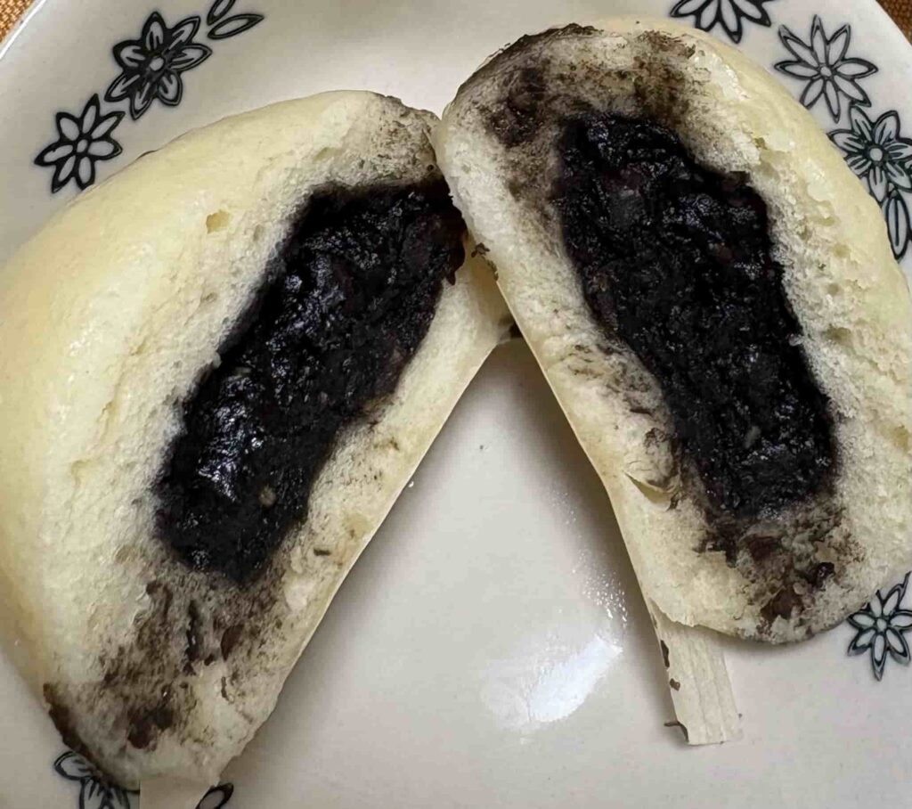 本店のあんまんは、見た目は普通の中華まんと同じですが、中を割るとびっくりするくらい真っ黒な餡が登場します。この色の正体は、たっぷり混ぜ込まれた黒ごま。