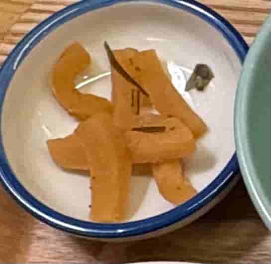 たまり漬けという漬物で野菜を塩漬けした後に、塩抜きをして醤油ベースの調味料に漬けたものです。このお店では大根のたまり漬けで、食感と味覚と鼻を刺激してくるようなすっきりした味がとても魅力的でした。